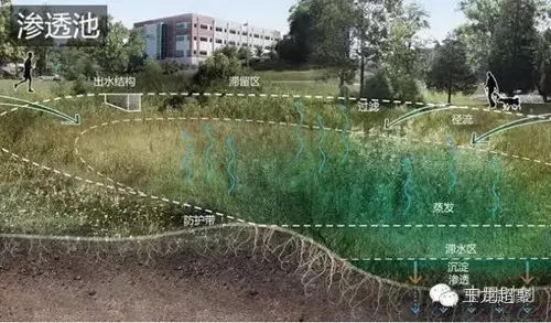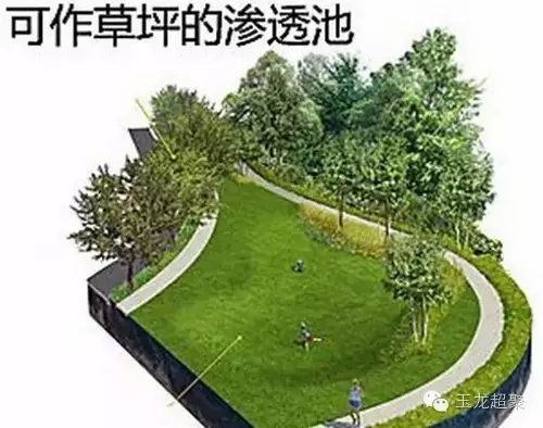 如果說以上的幾個措施都更適用于綠化空間較小的區域,那么滲透池則適用于綠地面積較大的開闊空間,滲水池能有效地削減徑流峰值,補充地下水。同時可以設計為草坪綠地,在天氣晴朗的時候供居民放松。