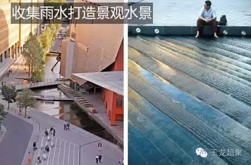 除了設于綠地的雨水管理措施,在硬質地面可以通過透水鋪裝實現雨水滲透,或通過水渠和溝槽將雨水引流至街道附近的滯留設施中,凈化的雨水可以就地消化于水景觀中,打造互動的親水景觀。