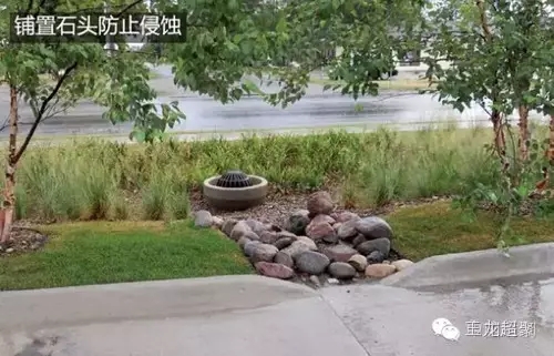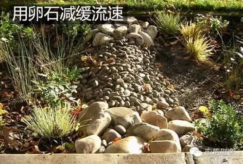 如果植草溝的豎向坡度較大超過4°,則應設置消能坎減緩水流,可以根據風格設計不同的消能坎。下圖中的消能坎為河中卵石鋪置而成。