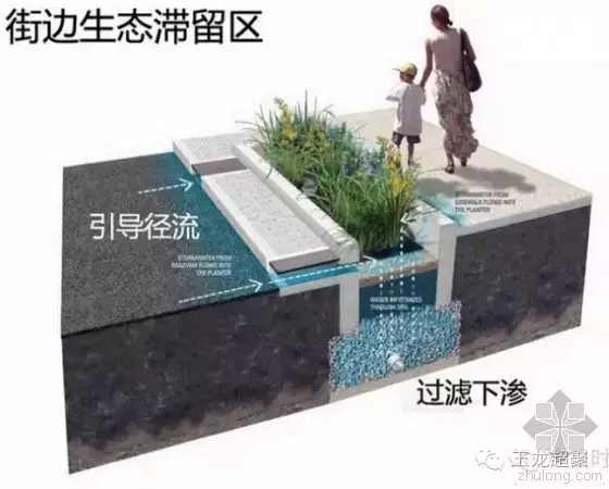 和雨水花園具有相同功能的措施還有生態滯留區。但較前者不同的是,生態滯留區土壤對于工程技術要求相當嚴格,對于土壤和工程排水結構也都有明確的要求,并且根據位置的不同可分為生態滯留帶、生態樹池、生態滯留池等。如同下圖街邊生態滯留區,通過對街豁口將路面徑流引流至收水區進行蓄留。