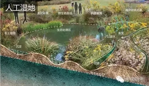 與滲透池規模相近但功能不同的人工濕地是對雨水調蓄與凈化的措施。其可以將雨水花園、植草溝等措施收集的雨水進行集中凈化,與其他處理手法一起形成多功能的雨水調蓄系統,打造怡人的濕地景觀。